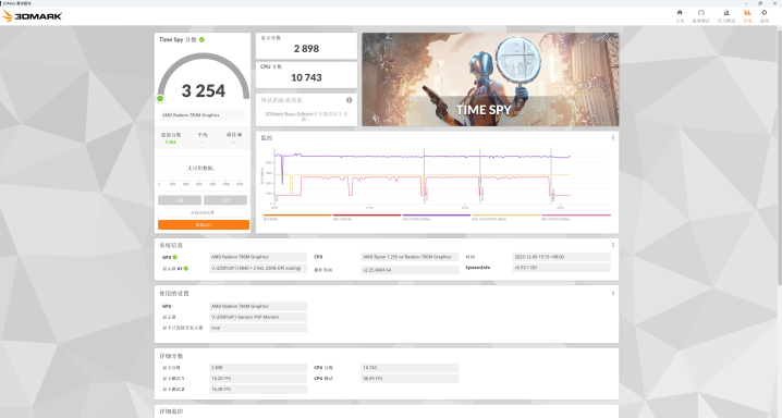 那么,这颗Radeon 780M的核显性能到底有多强?我们通过专业的显卡测试软件,3DMark跑分测试,在Time Spy测试中,跑分成绩为3254分,这个跑分成绩可以在1080P分辨率下,流畅运行大多数3A游戏大作了,可见AMD Radeon 780M 核显的性能已经很强了,是目前仍然处在第一梯队的核显。