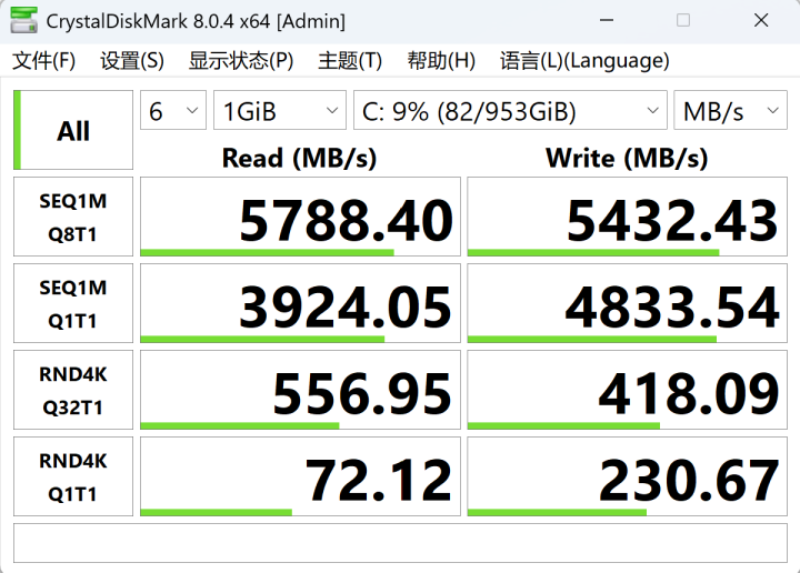 另外,在硬盘方面,零刻也是标配了支持 NVMe 协议的双 M.2 PCIe 4.0 插槽,标配了一根长存的 YMCT PC41Q 1T硬盘,通过CrystalDiskMark 的测试中,这块硬盘实测顺序读取速度5788.40MB/s,顺序写入速度5432.43MB/s,速度表现不错,达到了PCIe 4.0的标准,理论上这两个盘位都可以跑到满速7000MB/s,后面我打算给它的副盘位插一根2TB的硬盘,作为存储盘用。