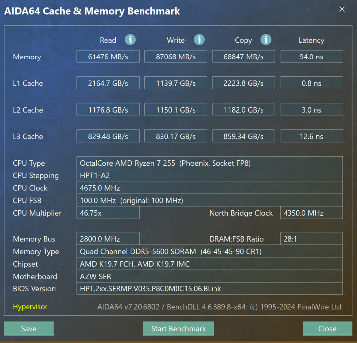通过AIDA64 跑分测试,读取速度为61476MB/s、写入速度为87068MB/s、拷贝速度为68847MB/s,延迟为94.0ns,零刻搭载的原厂内存的吞吐性能很强。