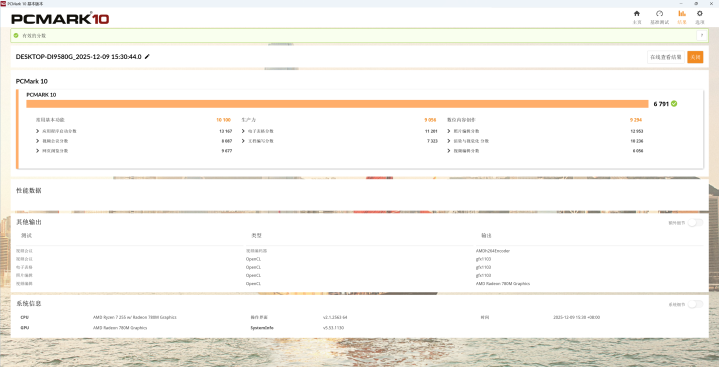 PCmark 10跑分测试:可以得到6791分,这个成绩也相当不错,完全满足日常的生产力工具使用。