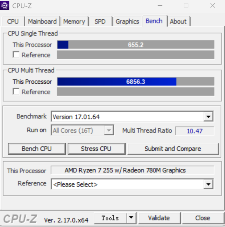 通过CPU-Z测试,CPU单核跑分689,多核7098分,从测试成绩来看,单核和多核的跑分都很强,从数据来看,性能要强于英特尔的i7-1260P。